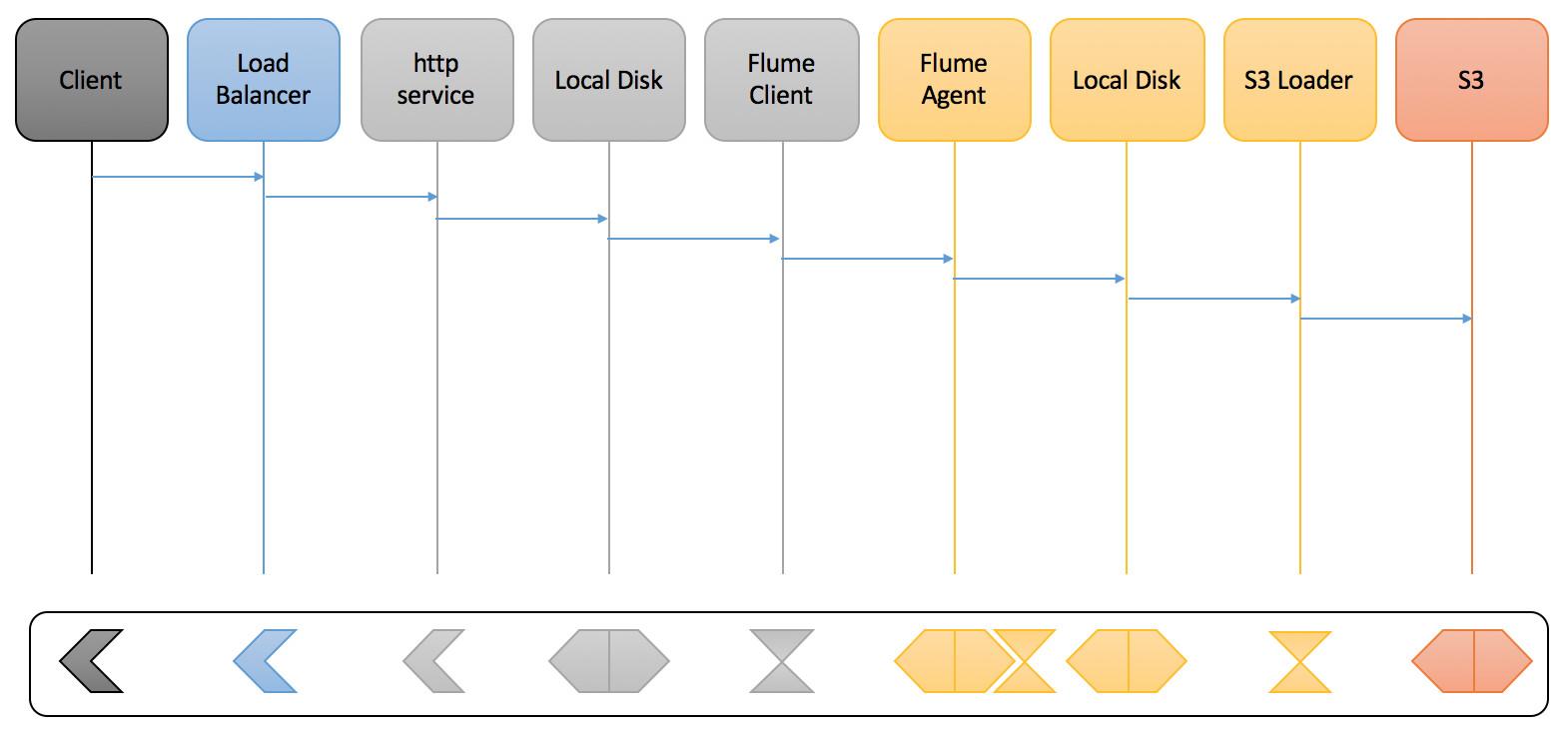 In the example pipeline analyzed there are 10s of millions of clients, 30 to 40 Front End Servers (FES), and 8 Flume Agents processing 17,000 events/second. The FES have many complexities that we will discuss in a future article for those who are interested. For now, we will just say that the FES receive, validate, transform data, and produce multiple data feeds, but for now we will model that as one feed. Data is aggregated from FES to a Flume Agent, then moved to S3. The design tries to avoid CAP tradeoffs by buffering data locally before transmitting to the next component.